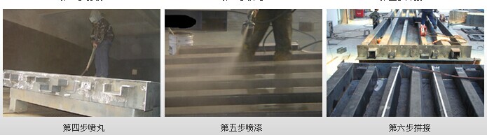6、外观处理工艺:钢板前期采用箱式喷砂机进行除锈及去氧化皮处理,之后喷涂两遍优质品牌的环氧富锌防锈底漆,面漆为丙烯酸聚氨脂桔纹船用漆,耐磨耐压耐老化,解决台面腐蚀问题。